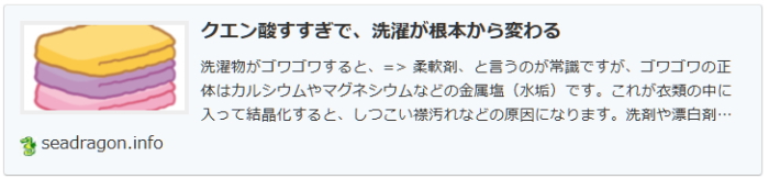 こうしたクエン酸水の、驚きの効果が実感できたら、さらに、日頃の洗濯にもクエン酸すすぎを適用することを、おすすめします。当研究所の本館に記事があります。↓をクリックすると移動できます。