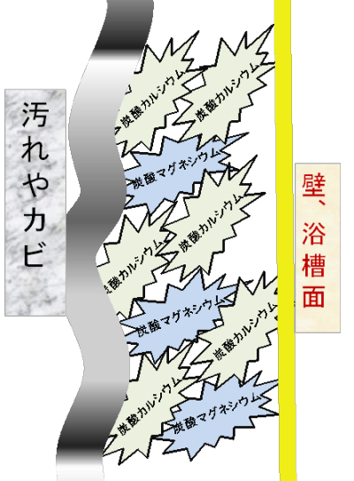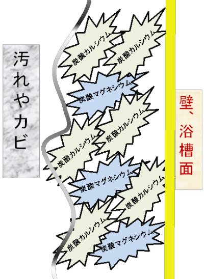 洗剤で洗うと汚れやカビの層は、下図のように薄くなりますが、水垢のザラザラにこびりついている部分はなかなか取れません。(水垢層は実際には、図のように水垢だけではなく、水垢と汚れやカビが混ざった複合層になっているのです)